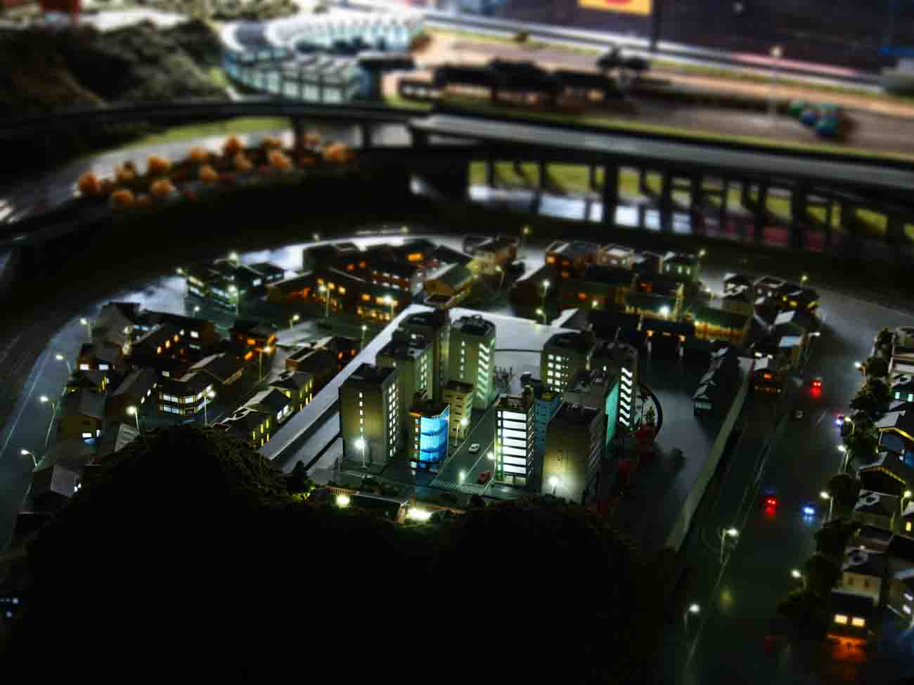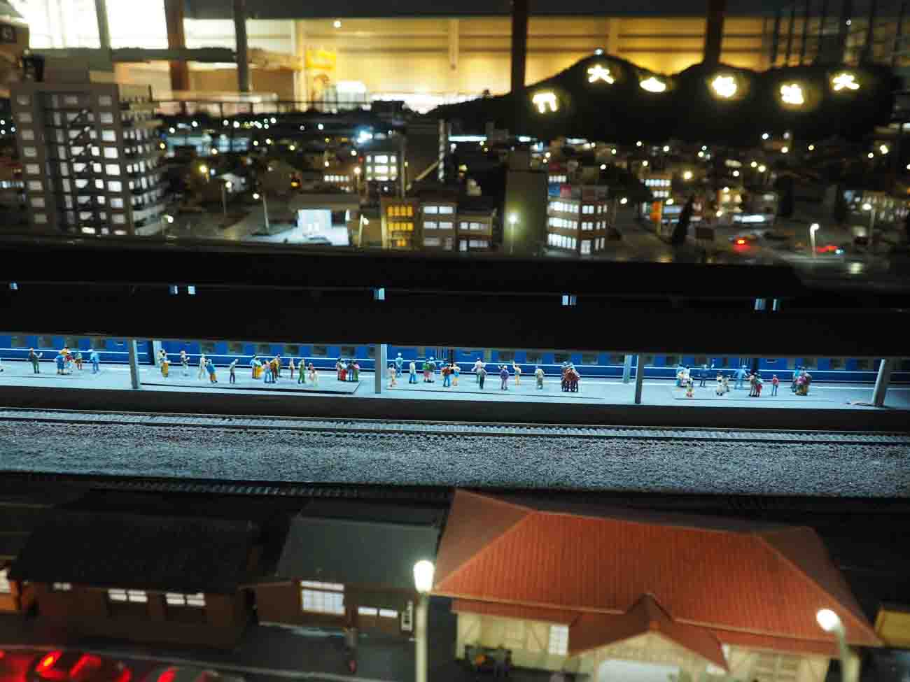 そして1日に3回(10:30、13:30、15:30)、ジオラマの街は夜の景色を見せてくれます。空を見上げるとドーム型の天井には満点の星と17種類の星座が。陸橋の上に立ち、この美しい星空と鉄道模型、ジオラマを眺めていると夜間飛行をしているようなロマンチックな気分になります。