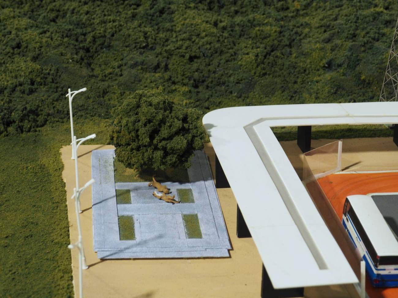 また、ジオラマ内の人々が繰り広げるドラマも見もの。おや、線路脇ではライブが開催されていますよ。柱に登っている方は何をしているのでしょうねえ。