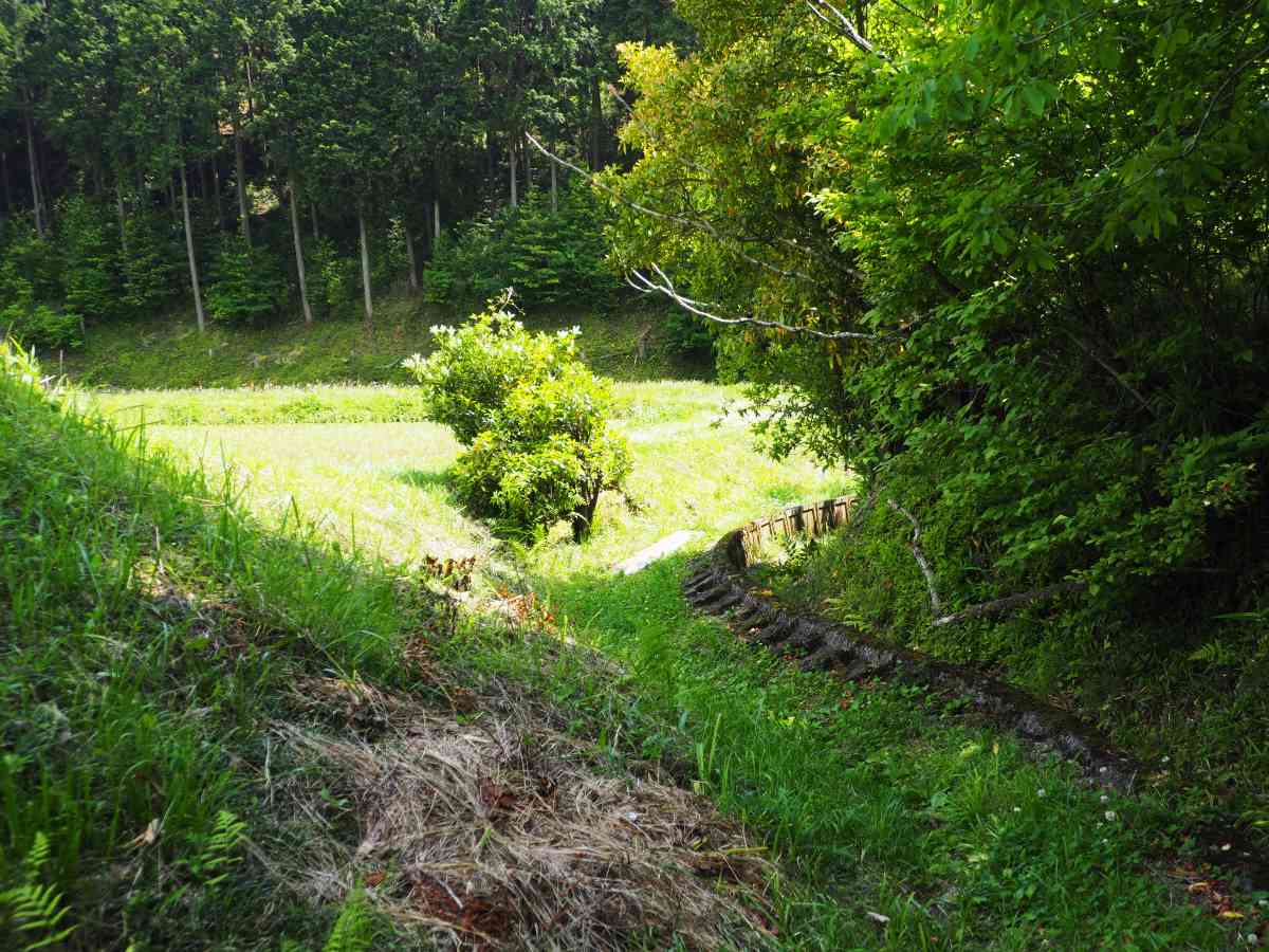 細い道はぐるぐるとカーブしながら登っていったかと思うと、今度は再びカーブを曲がりながら降りていきます。すると目の前が開け、田畑や家が見えてきました。