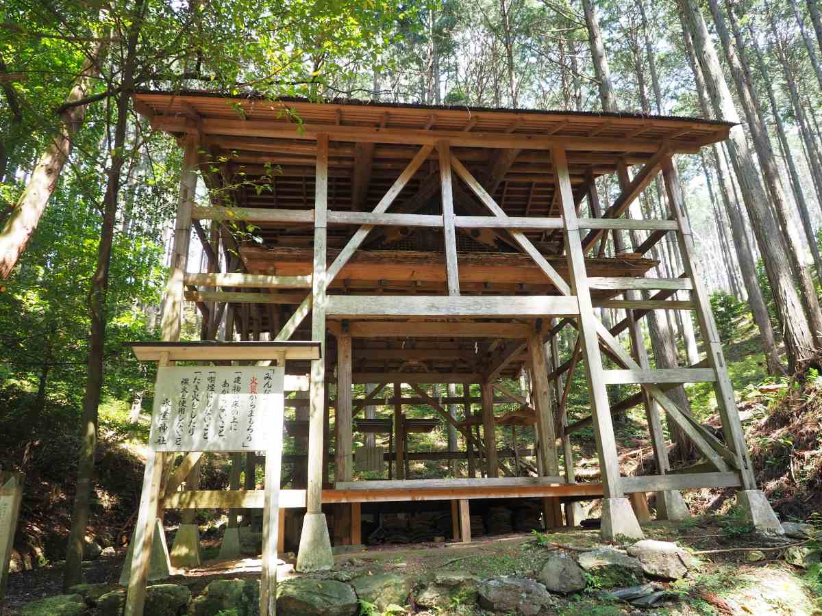 集落の中を進んでいくと現れたのが氷室神社。山の中にあり、なんだか良い氷ができそうな、ひんやりとした空気がただよっています。ご祭神は古墳時代の皇族・額田大中彦皇子(ぬかたのおおなつひこのみこ)に氷を作って献上したという稲置大山主神(いなぎのおおやまのぬしのかみ)。創建は不明ですが、由来書きによると、宮中で使われる氷のことに携わっていた清原家が氷室や氷池の守護神として建てたと伝わるのだとか。