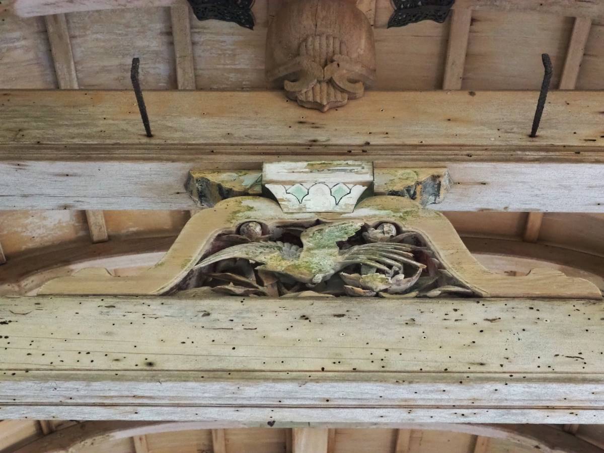 美しい桃山風の花鳥彫刻がほどこされた拝殿は、後水尾(ごみずのお)天皇の内裏小御所の庭にあった釣殿の遺構。寄進したのは、徳川家から後水尾天皇の元にお嫁に行った徳川和子こと東福門院と伝わっています。