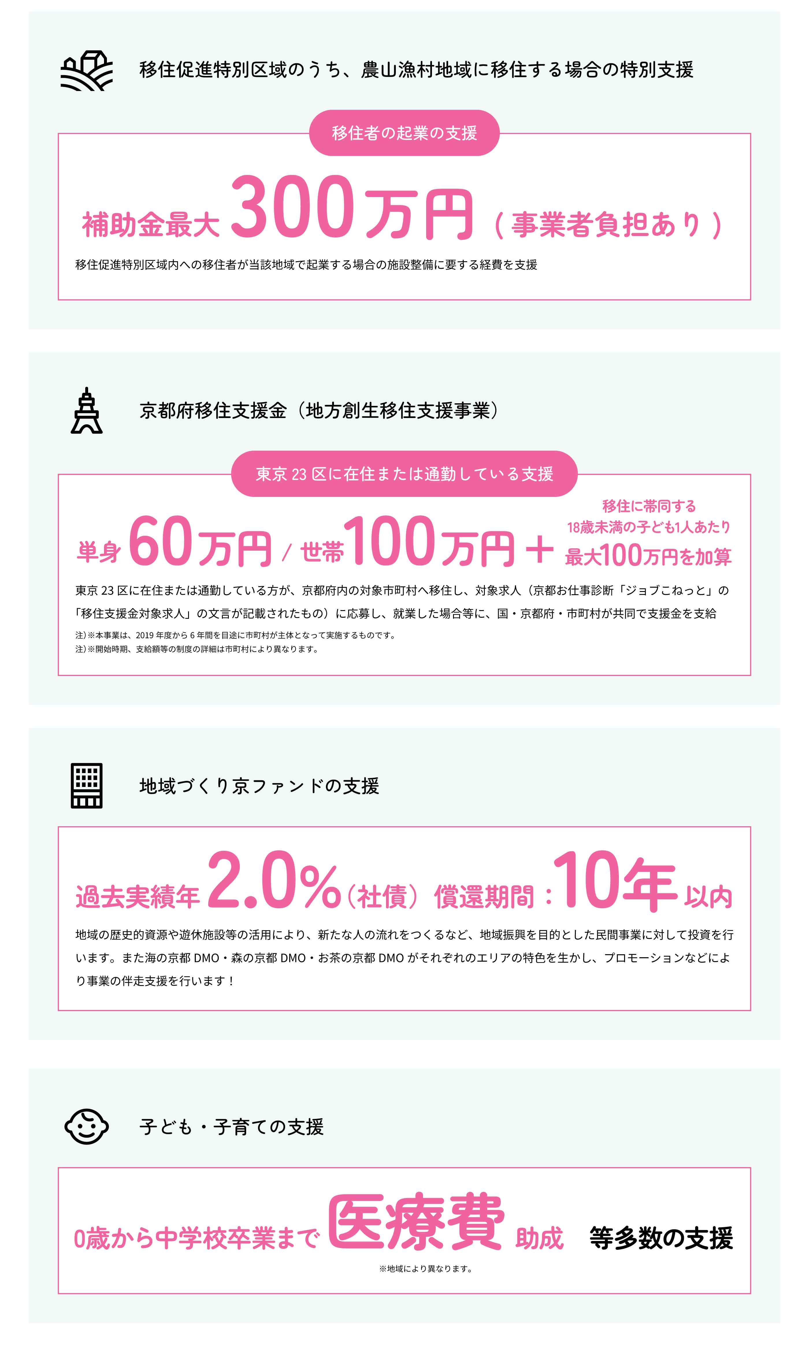 「出産お祝い金」「医療費助成」「子育て交流センターの設置」など、子育て世帯への支援制度やサポートは市町村によって異なりますので、移住希望先の市町村へお問い合わせください。なお、各市町村の移住相談窓口は、京都府公式移住・定住情報サイト「今日と明日」からご確認いただけます。